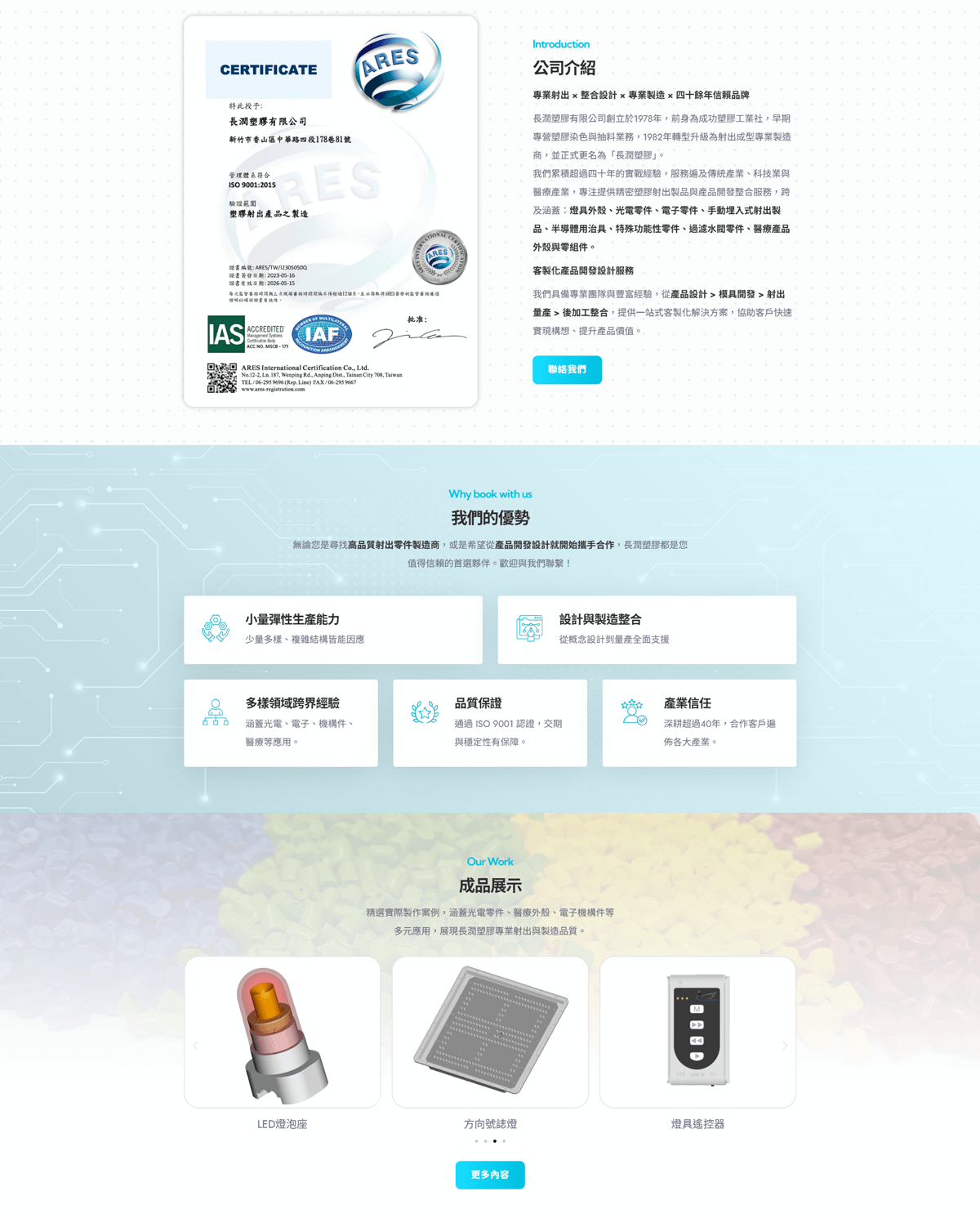 我們累積超過四十年的實戰經驗,服務遍及傳統產業、科技業與醫療產業,專注提供精密塑膠射出製品與產品開發整合服務,跨及涵蓋:燈具外殼、光電零件、電子零件、手動埋入式射出製品、半導體用治具、特殊功能性零件、過濾水閥零件、醫療產品外殼與零組件。