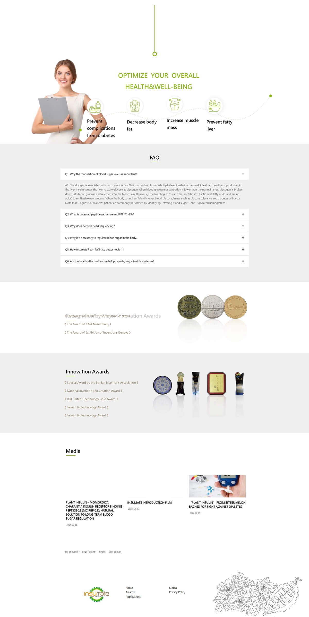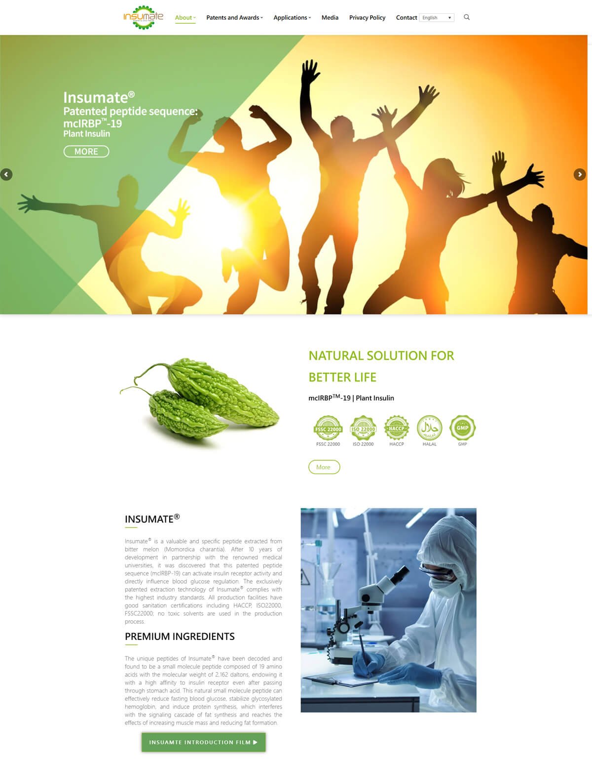 Insumate® is a valuable and specific peptide extracted from bitter melon (Momordica charantia). After 10 years of development in partnership with the renowned medical universities, it was discovered that this patented peptide sequence (mcIRBP-19) can activate insulin receptor activity and directly influence blood glucose regulation. The exclusively patented extraction technology of Insumate® complies with the highest industry standards. All production facilities have good sanitation certifications including HACCP, ISO22000, FSSC22000; no toxic solvents are used in the production process.
