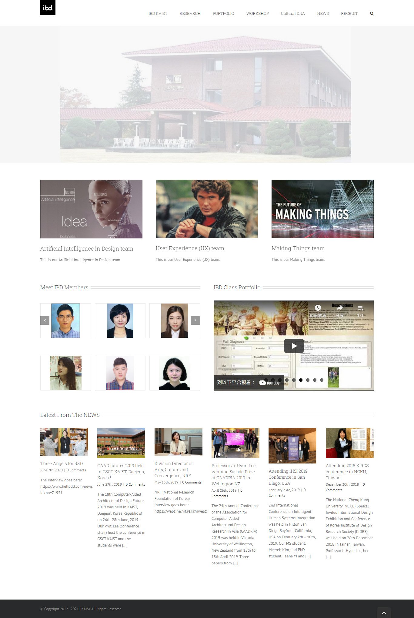 The Information-Based Design (IBD) research group is in the Graduate School of Culture Technology (GSCT) at KAIST. IBD focuses on the Computational Design research field that aims to explore ways of juxtaposing computational approaches and applications with professional practice and theory in design. Therefore, the researchers are investigating to make the design environment more intelligent and easy to use through applying computational approaches such as artificial intelligence (AI) and human-computer interaction (HCI) on the basis of three related foundation fields: cognitive science, mathematics and design theory. The IBD research group is divided by three interdisciplinary teams that are not mutually exclusive: (1) Artificial Intelligence in Design, (2) User Experience (UX), and (3) Making Things. These explorations result in computer-based frameworks or systems contributing to the enhancement of the calculability using algorithmic and/or heuristic computational methods. In other words, the IBD research focus is on ‘computational culture’ as an extension of computational design.