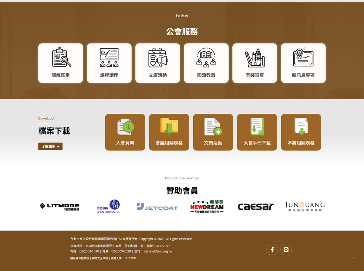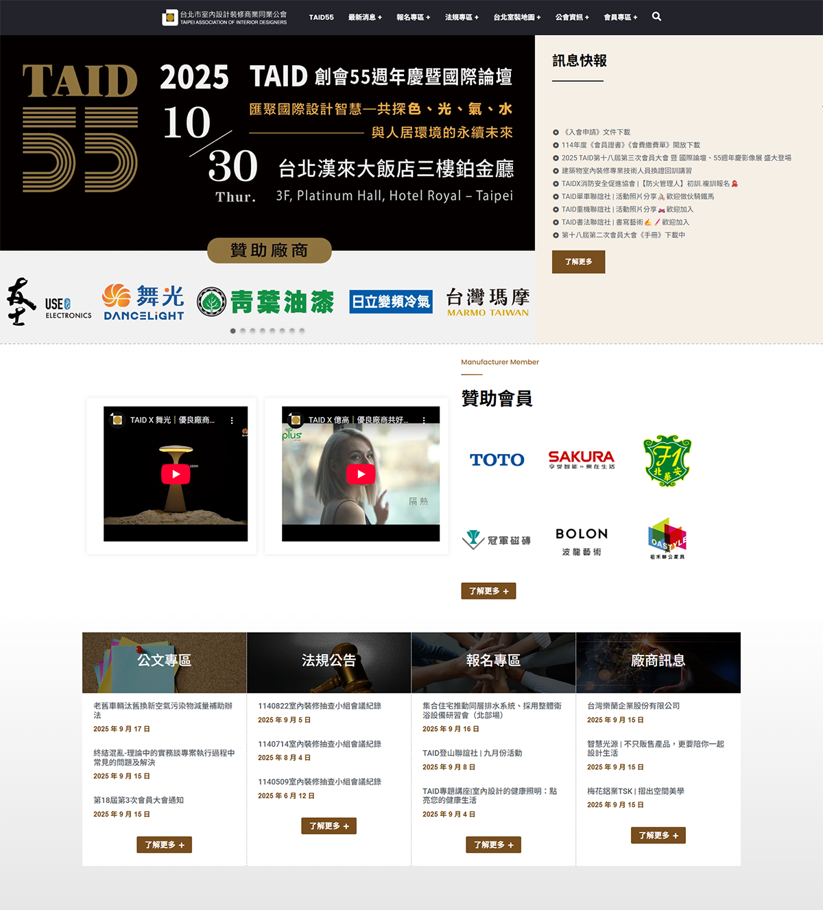 TAID(Taipei Association of Interior Designers)是本會英文簡稱,也是代表本會的品牌標誌。回首會史,在前輩理監事們及會員多年的辛勤耕耘下,本會方有今日之成果。我們深知,身為首都地區室內設計裝修公會,會員中能夠匯聚最多本業菁英與優良廠商,這是我們的優勢,亦是無可旁貸的責任。未來,本會將秉持創會宗旨,持續維護與爭取會員本業權益。